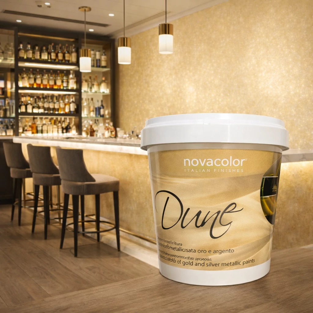 Fémhatású dekorációs falfesték - Dune Gold - Novacolor egy prémium kategóriás dekorfalfesték beltéri használatra, amely különleges világos arany metálhatást biztosít a falakon. A festék puha, fémes mikrorészecskéket tartalmaz, amelyek finom fény- és árnyjátékot hoznak létre a felületen, így a helyiség falai élénk, elegáns és háromdimenziós megjelenést kapnak.
